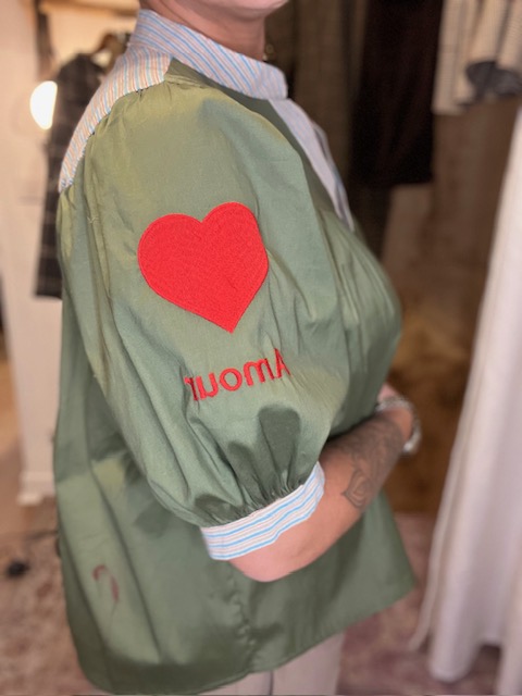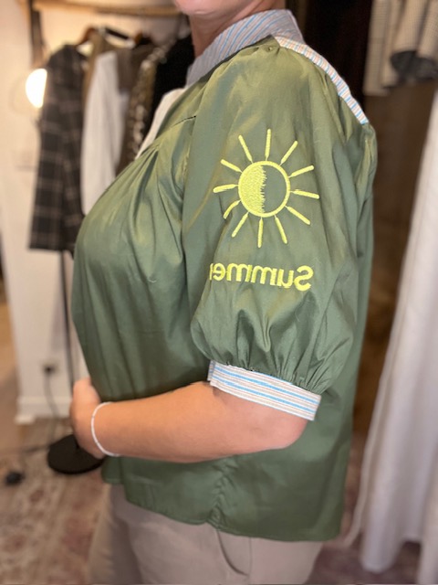 Blouse kaki à manches courtes ballon , avec détails broderie sur les manches. Taille unique