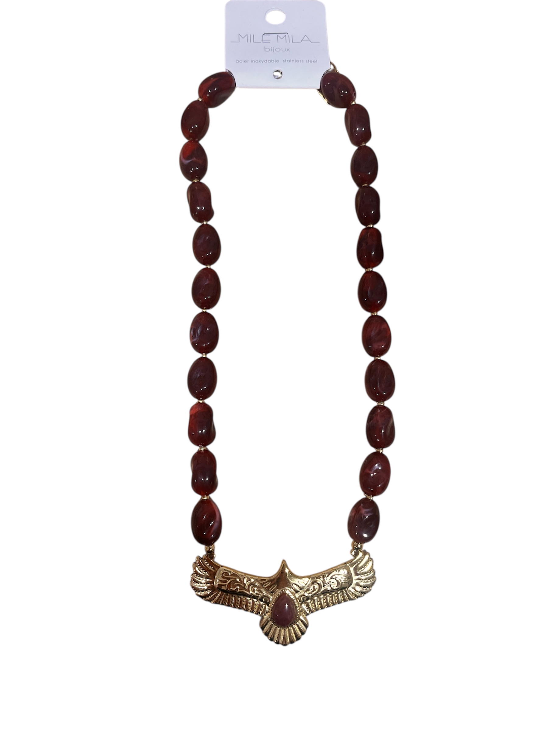 Affirmez votre style avec ce collier Milé Mila orné d’un pendentif aigle doré sculpté et de perles bordeaux élégantes. Confectionné en acier inoxydable , il allie caractère et raffinement .