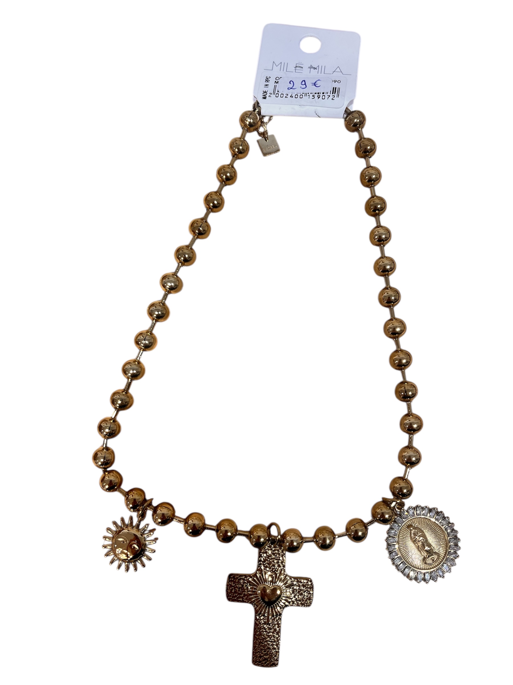 Ce collier Milé Mila se distingue par ses perles dorées et ses pampilles symboliques : un soleil, une croix au coeur sacré et une médaille gravée .