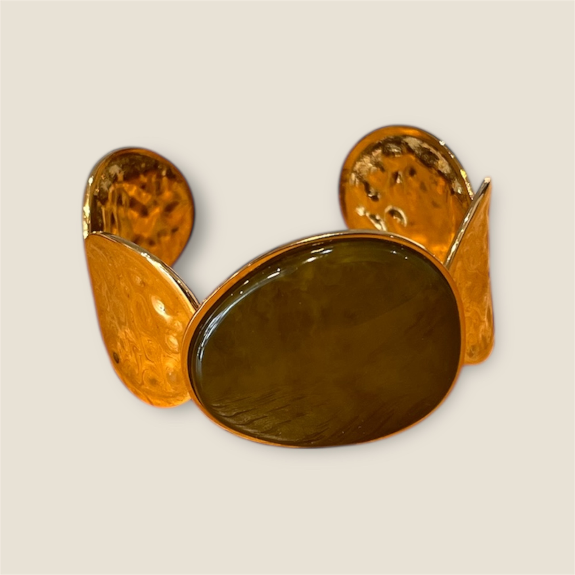 Jonc en acier inoxydable orné d’une pierre en forme de galet vert kaki.